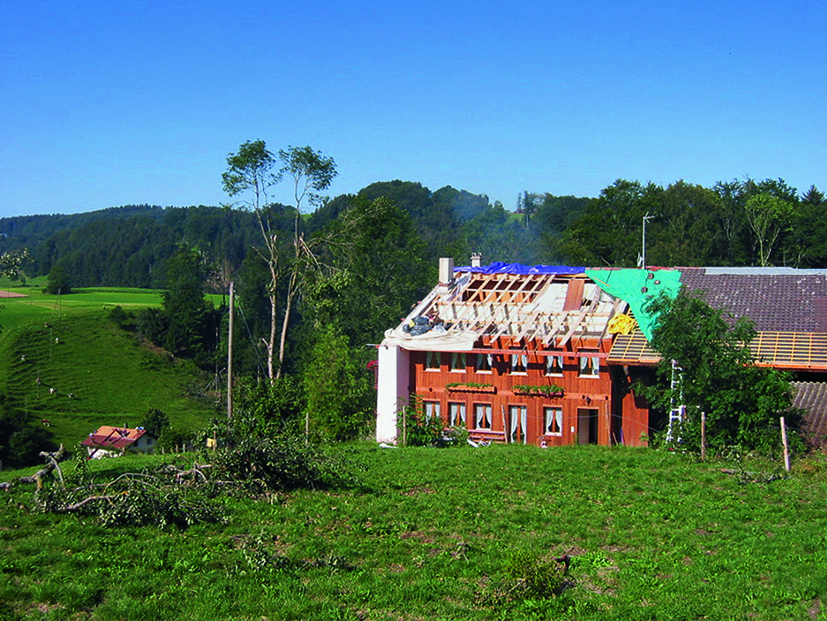 Stürme können überall in der Schweiz auftreten und beachtliche Kräfte entwickeln. In Böen vervielfacht sich lokal die Kraft des Windes, z.B. auf Dächern und an Fassaden. Wenn sich Druck- und Sogkräfte in die gleiche Richtung überlagern, verstärken sich diese Kräfte zusätzlich, zum Beispiel an Dachvorsprüngen oder wenn das Gebäude nicht winddicht ist. Für den Gebäudeschutz vor Wind ist die konsequente Einhaltung der Baunormen zentral, insbesondere der Norm SIA 261.